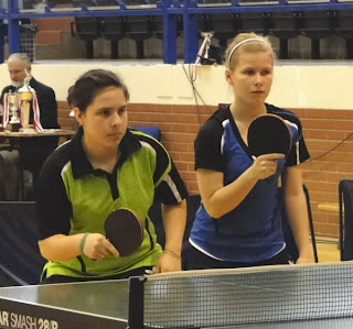 Sylwia i Ola mocno musiały się napracować, by awansować do finału Drużynowych Mistrzostw Polski Kadetek. Na zdjęciu w pierwszym meczu z Salosem Suwałki (rywalki w głębi stołu)